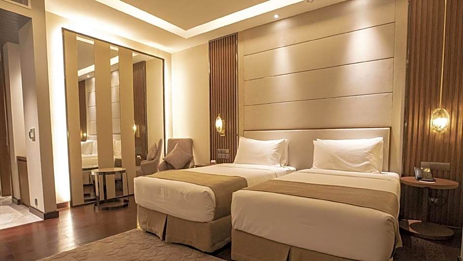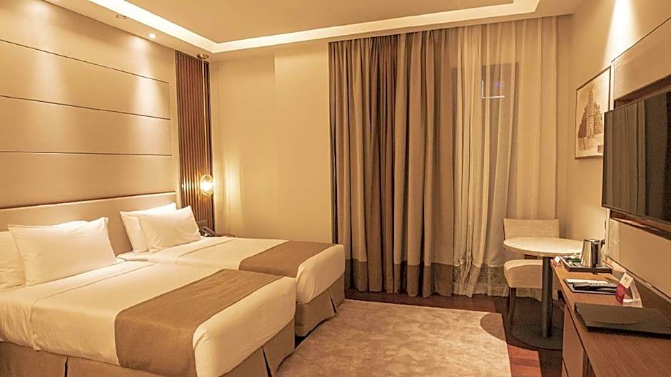 The spacious air-conditioned twin room offers a flat-screen TV with cable channels, a mini-bar, a tea and coffee maker, a seating area as well as city views. The unit has 2 beds.
